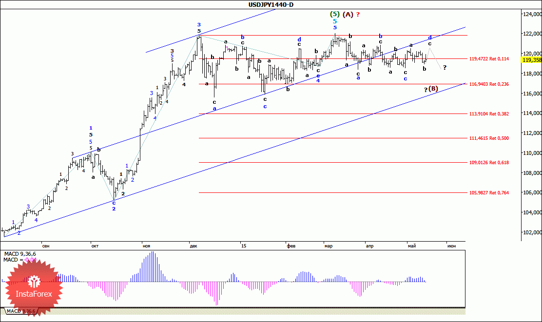 Как ожидалось, минувшая неделя не внесла существенных изменений в складывающуюся волновую ситуацию по паре USD/JPY. При этом цена продолжила движение в диапазоне, оставаясь между уровнями 119 и 120 фигур. Таким образом, можно предположить, что валютная пара по-прежнему находилась в пределах приобретающей все более сложную и трудночитаемую форму волны (В), формируя ее волну d. Если это так, то еще некоторое время валютная пара будет оставаться в границах коридора, ограниченного уровнями 118,00 – 121,00.