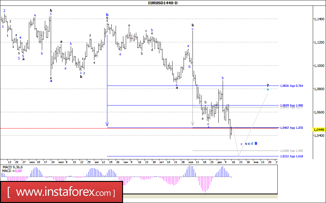 Решение FOMC увеличить ключевую ставку на 0.25% привело к падению пары EUR/USD более чем на 300 п.п. от достигнутого в середине минувшей недели максимума (1,0670). При этом можно предположить, что, несмотря на пробой минимума 15 года, валютная пара осталась в стадии формирования волны с, в с, в d, в В, которая начала приобретать вид наклонного коррекционного треугольника. Если это так, то в процессе завершения этой волны d, в В внутренняя волновая структура ее волны с, в с, в с, в d, примет еще более сложную форму, а цена (как минимум) достигнет отметки 1,0220.