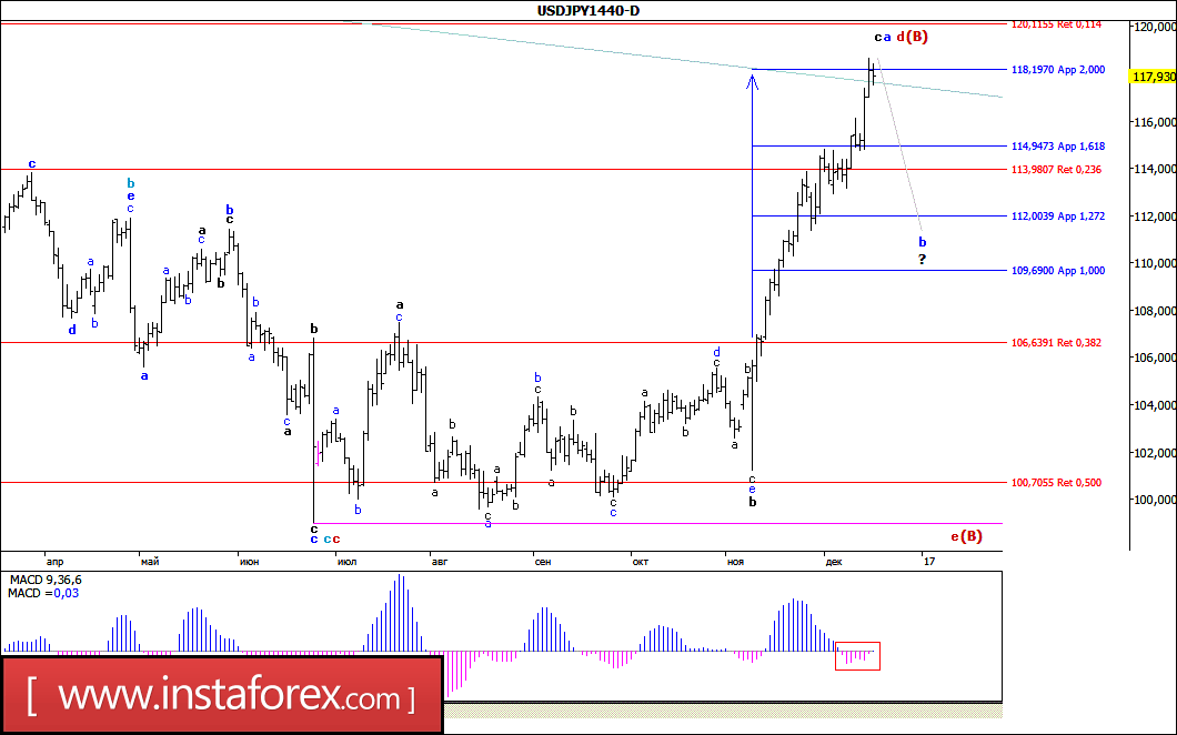 На волне возобновившегося укрепления доллара пара USD/JPY не смогла выполнить разворот ни от уровня 115-й, ни от уровня 116-й фигуры, а, продолжив восходящее движение, в четверг отработала уровень 118,00. При этом можно предположить, что валютная пара осталась в стадии формирования принимающей все более удлиненный вид волны с, в а, в d, в (В). Если это так, то, принимая во внимание остающийся в отрицательной зоне MACD_ак, а также достигнутое двукратное равенство между размерностями волн а и с, в а, в d, в (В), можно ожидать, что повторное тестирование уровня 118,00 все же приведет к развороту цены в пользу иены и обозначит начало будущей волны b, в d, в (В), а возможно и волны е, в (В).