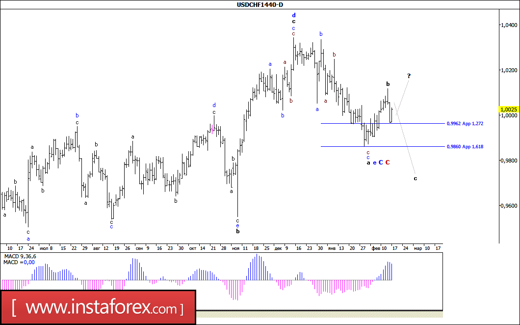 В целом ожидаемо, пробой в минувшую среду уровня 1,0100 спровоцировал отскок цены по паре USD/CHF более чем на 150 п.п. от достигнутого максимума. При этом можно предположить, что валютная пара уже завершила волну b, в е, в С, в С и предприняла попытку обозначить начало волны с, в этой е, в С, в С. Если это так и волна b, в е, в С, в С, не станет принимать еще более сложную форму, то валютная пара продолжит начавшееся снижение котировок в направлении целей, расположенных под уровнем 98-й фигуры.