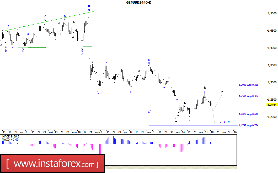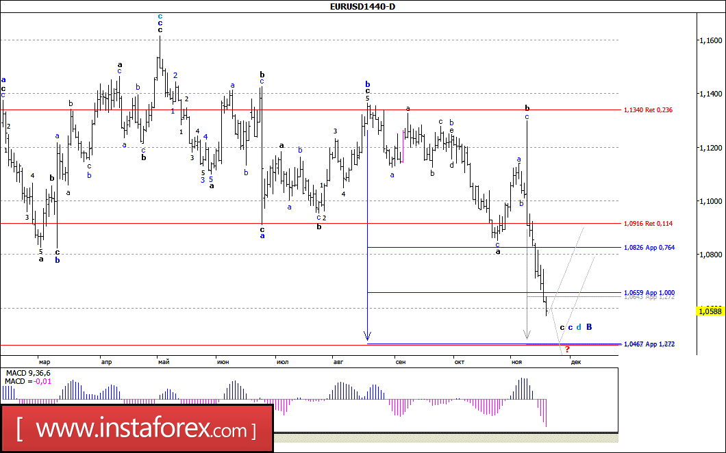 Торги минувшей недели пара EUR/USD начала с продолжения нисходящего движения, начавшегося после завершения избирательного процесса в США, и в пятницу смогла зафиксироваться под уровнем 06-й фигуры. Таким образом, можно предположить, что дальнейшее развитие волновой структуры волны с, в с, в d, в В приведет к снижению цены в район мартовских минимумов 2015 года. В то же время следует отметить, что падение котировок под этот минимум более чем полуторагодовой давности, спровоцирует, скорее всего, необходимость пересмотра волновой разметки всей волны В.