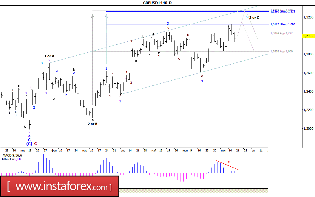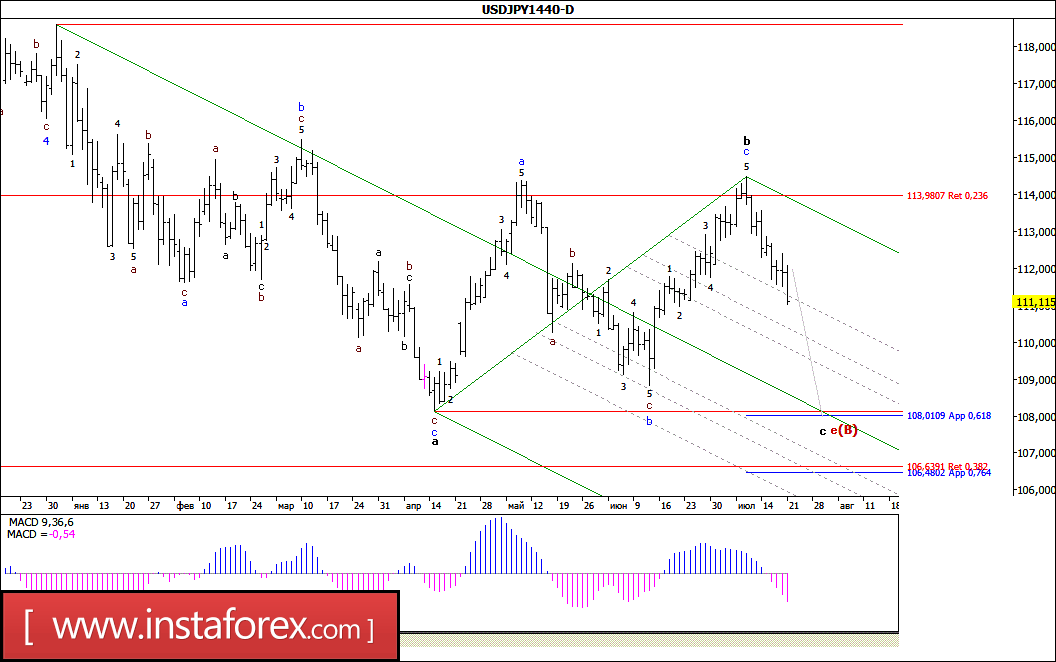 Инструмент продолжает построение восходящей волны В. На этой неделе повышение котировок может продолжиться в рамках предполагаемой волны с, в с, в е, в В с целями, расположенными около расчетных отметок 1,1773 и 1,1847, что соответствует 261,8% и 38,2% по Фибоначчи. Волна е, в В усложнила свою внутреннюю структуру. После завершения этой волны ожидается протяженное снижение в рамках волны С. Дивергенция MACD_ака предупреждает о возможном завершении построения волны B, но повышательный коридор сохраняет перспективы повышения котировок.