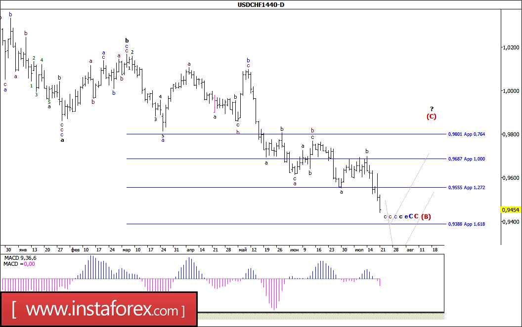В ходе торгов минувшей недели пара USD/CHF все же возобновила нисходящее движение и, потеряв около 200 п.п., завершила пятничную сессию достижением отметки 0,9440. Таким образом, можно предположить, что после пробоя июньского минимума (0,9550) валютная пара продолжила формирование волны с, в с, в е, в С, в С, в (В), в еще более сложном и протяженном во времени виде. Если это так, то у валютной пары появились перспективы для дальнейшего снижения котировок к уровню 94-й или даже 92-й фигуры.
