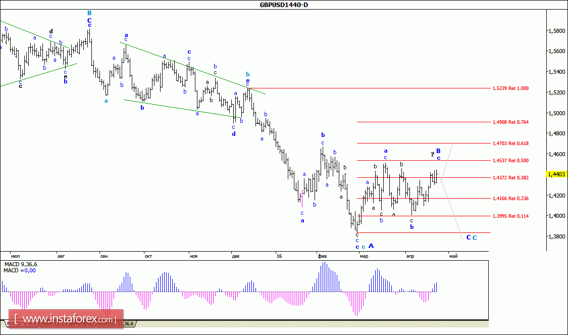 Начав минувшую неделю с восходящего движения, пара GBP/USD не смогла закрепить наметившийся успех и до закрытия пятничной сессии оставалась в диапазоне между уровнями 43-й и 44-й фигур. Таким образом, из-за несколько затянувшейся неспособности валютной пары определиться с направлением развития тренда, сложившаяся волновая картина позволяет предполагать, что после отхода от минимума 29 февраля цена находится в стадии формирования волны В в составе принявшей значительно более сложную форму волны С главного понижающего тренда. Если это так, то прежде чем обозначить начало будущей волны С, в С, валютная пара может продолжить рост котировок вплоть до уровня 1,4700.