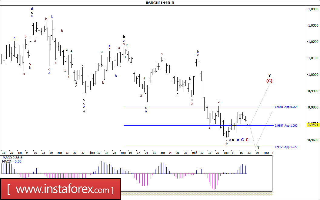 Волновая разметка инструмента предполагает построение повышательной волны (С). Инструмент может продолжить начатое повышение с целями, расположенными вблизи 100 и 101 фигур. Со временем цели этой волны будут уточнены. Волна е, в С, в С, в (В) может усложниться еще больше, в этом случае понижение котировок возобновиться с целями, расположенными около расчетной отметки 0,9555, что соответствует 127,2% по Фибоначчи, и ниже около 94 фигуры.
