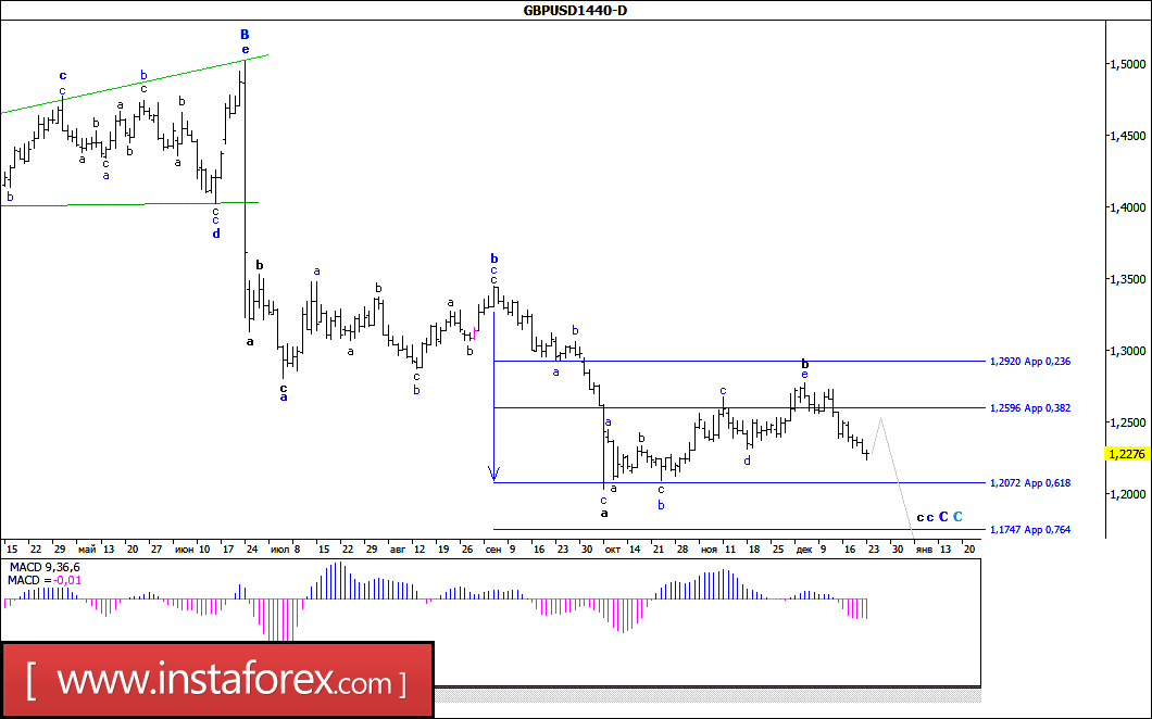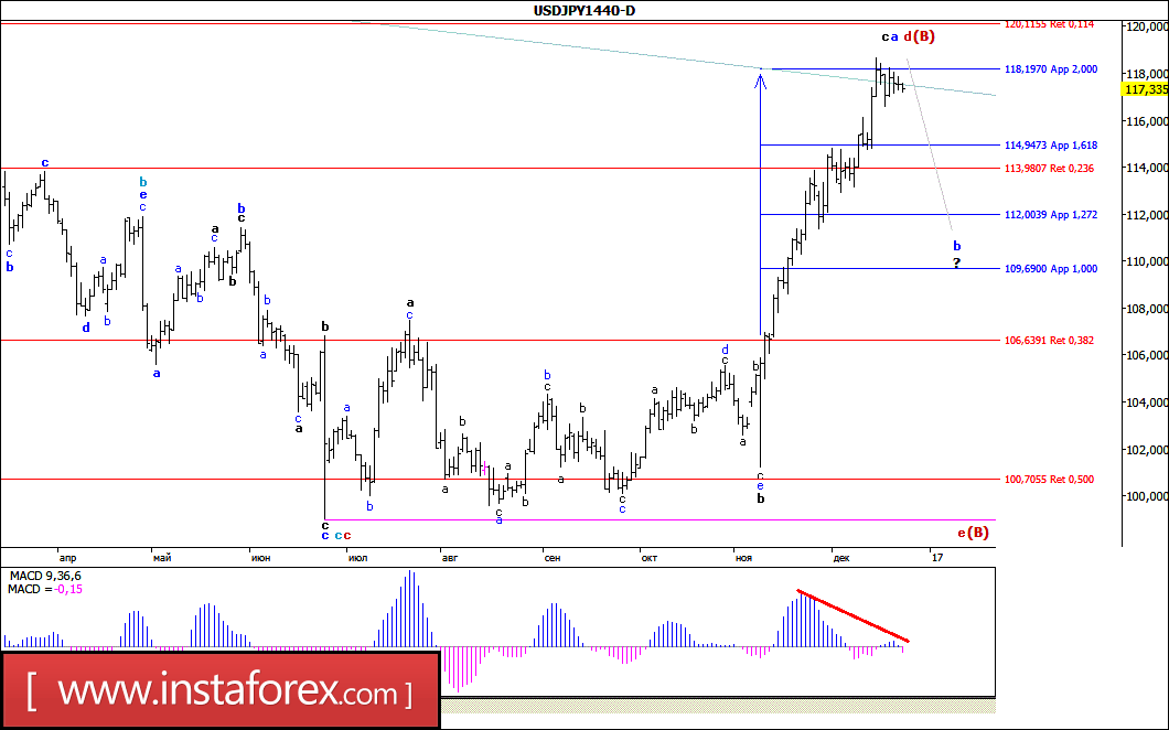 Предпраздничная неделя не позволила паре USD/JPY определиться с направлением движения, вследствие чего до закрытия пятничной сессии цена оставалась в диапазоне преимущественно между уровнями 117-й и 118-й фигур. При этом можно предположить, что валютная пара предпринимала попытки завершить процесс формирования принявшей сильно удлиненный вид волны с, в а, в d, в (В). Если это так, то достаточно сильная дивергенция MACD_ака указывает на сохраняющийся у валютной пары потенциал для выполнения разворота против доллара - или от уже достигнутого 15 декабря максимума (118,65), или после его повторного обновления.