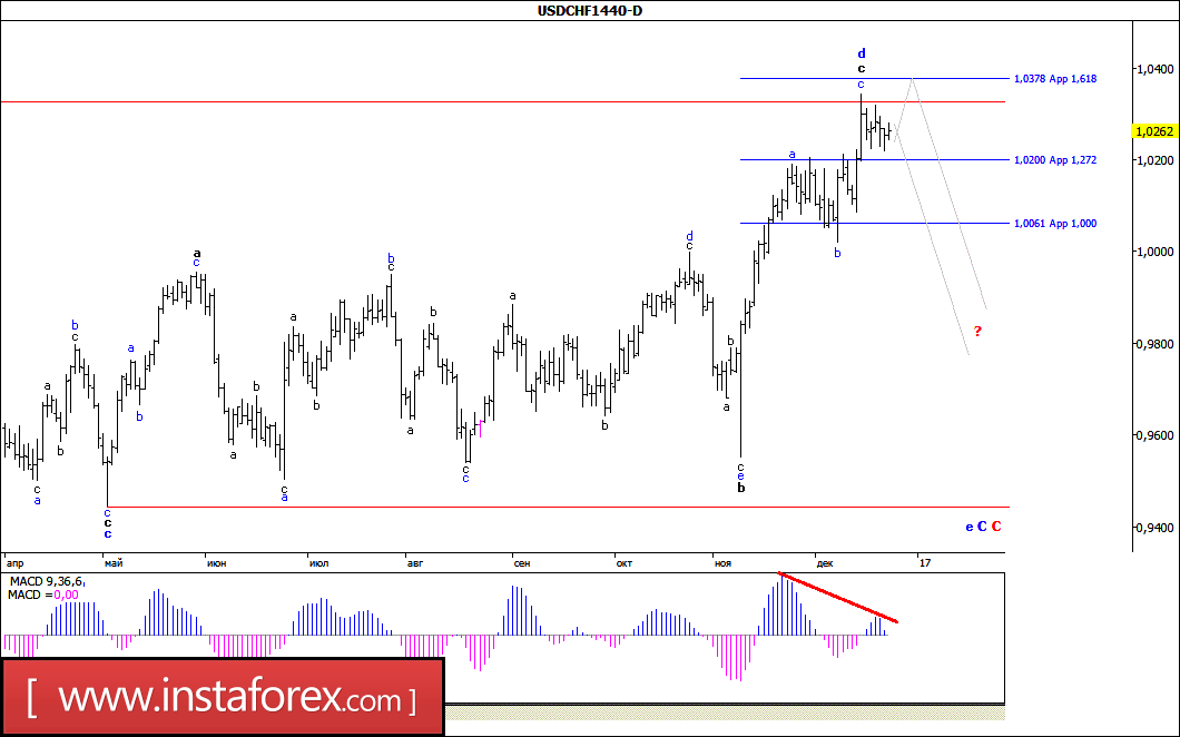В ходе торгов минувшей недели пара USD/CHF так и не смогла определиться с направлением движения, оставаясь до конца пятничной сессии в диапазоне между уровнями 1,0200-1,0300. Таким образом, можно предположить, что валютная пара предпринимала попытки завершить процесс формирования принявшей несколько удлиненный вид волны с, в d, в С, в С. Если это так, то достаточно сильная дивергенция MACD_ака указывает на возможность перехода валютной пары в стадию формирования волны е, в С, в С или от достигнутого 15 декабря максимума (1,0340), или после роста цены к отметке 1,0380.