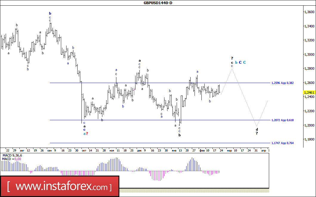 Фунт стерлингов находится в стадии построения понижательной волны С, в С. Понижение котировок может начаться с целями, расположенными около расчетных отметок 1,2072 и 1,1747, что соответствует 61,8% и 76,4% по Фибоначчи в рамках волны d, в b, в С, в С. В рамках коррекционной повышательной волны (возможно, в составе С, в С), инструмент может продолжить повышение с целями, расположенными около расчетных отметок 1,2596, что соответствует 38,2% по Фибоначчи, и выше около 27 фигуры.