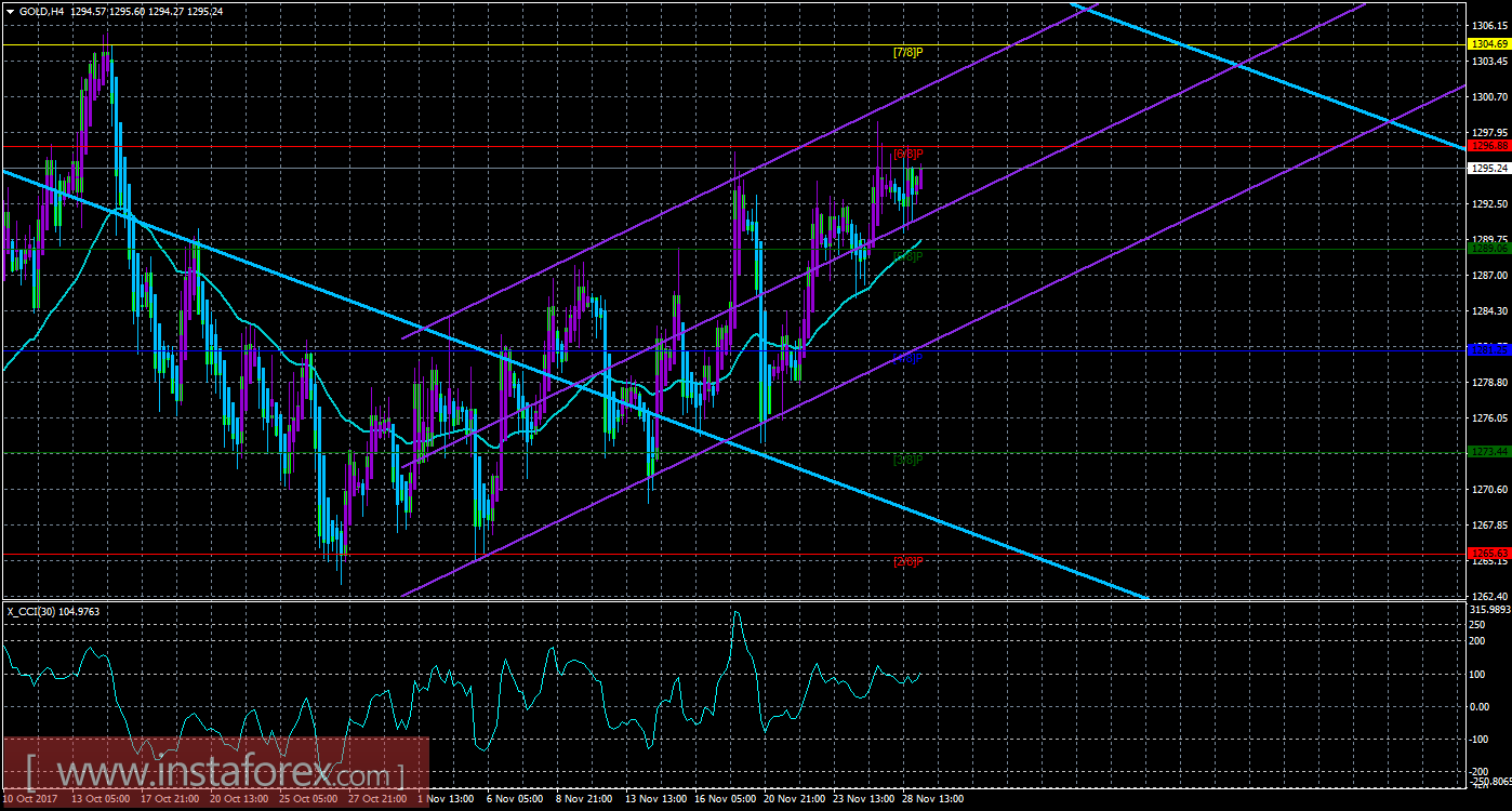 Техническая картина золота 29 ноября показывает, что цена пытается продолжить восходящий тренд, но не может преодолеть уровень Мюррея «6/8». Старший канал направлен вниз, что свидетельствует о нисходящей тенденции в долгосрочном плане. Младший канал направлен вверх, что означает восходящую тенденцию в среднесрочном плане. Сейчас цена находится выше скользящей средней и выше уровня Мюррея «5/8», что прогнозирует восходящее направление движения в ближайшее время. Первой целью для движения вверх, таким образом, является уровень Мюррея «6/8» - 1296,88, который уже был отработан. Если этот таргет будет преодолен, то новой актуальной целью будет выступать уровень Мюррея «7/8» - 1304,69. Скользящая средняя направлена вверх, а цена располагается выше нее, поэтому сейчас более вероятно восходящее движение. Хайкен Аши окрасил последние бары в фиолетовый цвет, что указывает на локальное движение вверх, разворот индикатора вниз укажет на новый виток коррекционного движения, а длинные позиции станут на время не актуальными. Шорты можно будет рассматривать не ранее закрепления цены ниже мувинга. Индикатор CCI находится около уровня 100, что сигнализирует о наличие слабой перекупленности инструмента.
