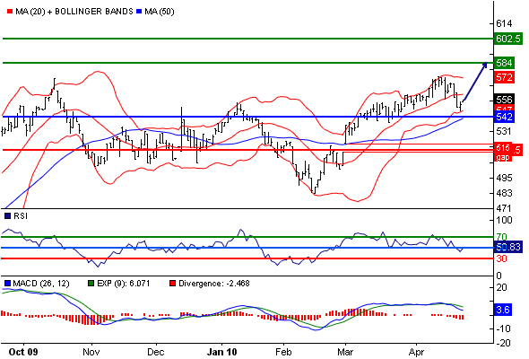 Комментарий : RSI находится выше нейтральной зоны 50. MACD позитивен и ниже своей сигнальной линии. Возможна коррекция. К тому же курс находится ниже своей 20-дневной скользящей средней (559.825) но выше своей 50-дневной скользящей средней (541.21).