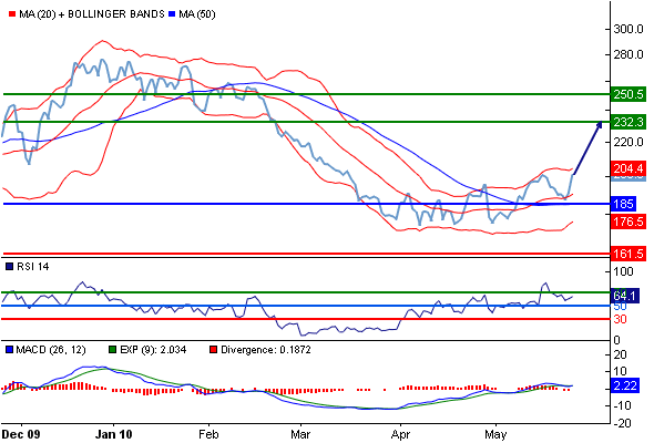 Комментарий : RSI находится выше нейтральной зоны 50. MACD позитивен и выше своей сигнальной линии. Кроме того, курс находится выше своих 20 и 50-дневных скользящих средних (соответственно находящихся на уровнях 190.465 и 185.56).