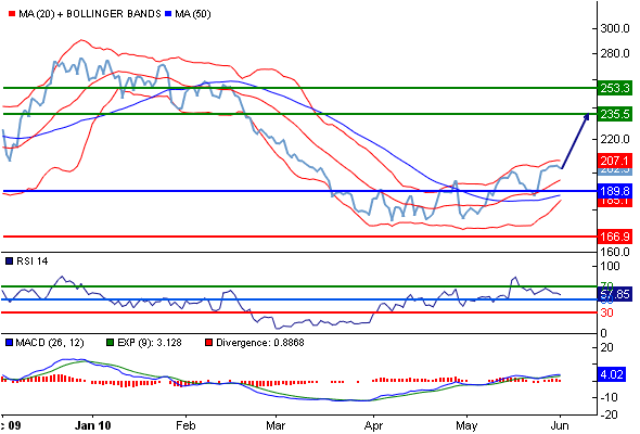 Комментарий : RSI находится выше нейтральной зоны 50. MACD позитивен и выше своей сигнальной линии. Кроме того, курс находится выше своих 20 и 50-дневных скользящих средних (соответственно находящихся на уровнях 196.07 и 187.824).