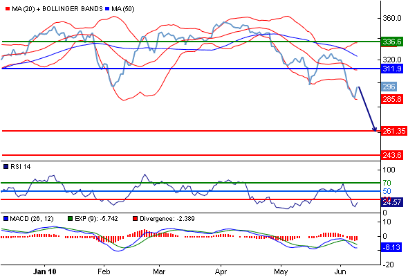 Комментарий : RSI находится ниже 30. Такое положение указывает сильный медвежий тренд, или же состояние перепроданности, тогда ожидается технический рост. В этом случае надо следить за появлением расхождений между развитием RSI и развитием курса. MACD ниже своей сигнальной линии и негативен. Конфигурация медвежья. К тому же курс находится ниже своих 20 и 50-дневных скользящих средних, сейчас располагающихся на уровнях 310.87 и 323.158.