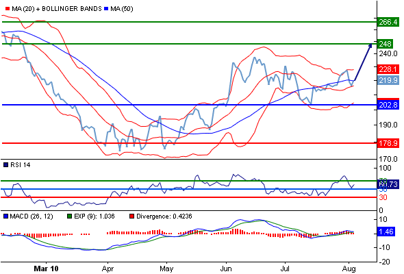 Комментарий : RSI выше уровня 50. MACD позитивен и выше своей сигнальной линии. Кроме того, курс находится выше своих 20 и 50-дневных скользящих средних (соответственно находящихся на уровнях 216.315 и 219.846).