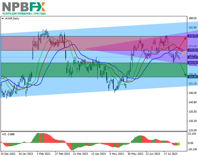 Акции American Express Co., одной из ведущих американских транснациональных компаний, предоставляющей услуги проведения платёжных операций, движутся в коррекционном тренде на уровне 166.00.