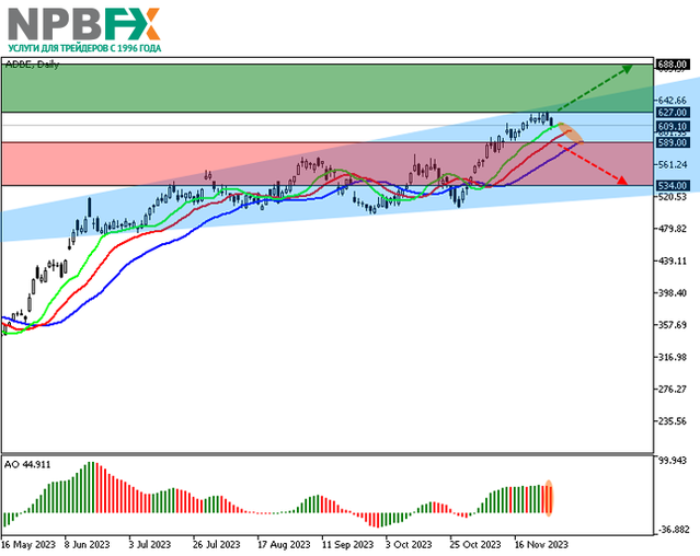 Акции Adobe Inc., ведущего американского разработчика программного обеспечения, движутся в коррекционном тренде на уровне 609.00.
