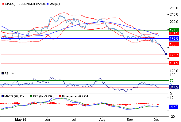 Комментарий : RSI ниже уровня 50.MACD негативен и ниже своей сигнальной линии. Конфигурация медвежья. Кроме того, курс находится ниже своих 20 и 50-дневных скользящих средних (соответственно находящихся на уровнях 178.595 и 185.528).