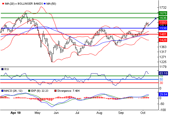 Комментарий : RSI находится выше 70. Это положение может указать сильный бычий тренд, или состояние перекупленности, в последнем случае ожидается техническая коррекция. Тогда надо следить за появлением расхождений между трендами RSI и курса. MACD позитивен и выше своей сигнальной линии. К тому же, курс находится выше своих 20 и 50-дневных скользящих средних, сейчас располагающихся на уровнях 1510.614 и 1480.4588.