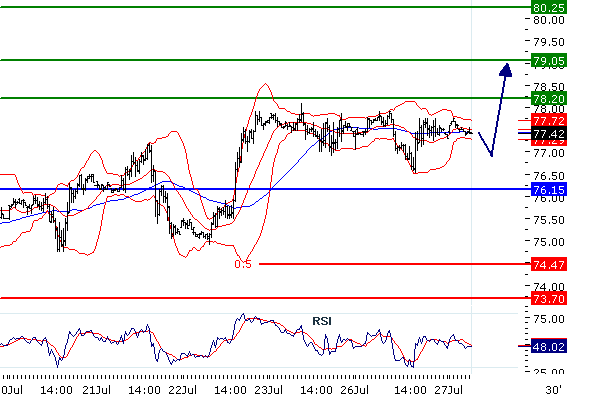 Наше предпочтение: ПОКУПАТЬ выше 76.15 с целевыми точками 78.2 и 79.05.