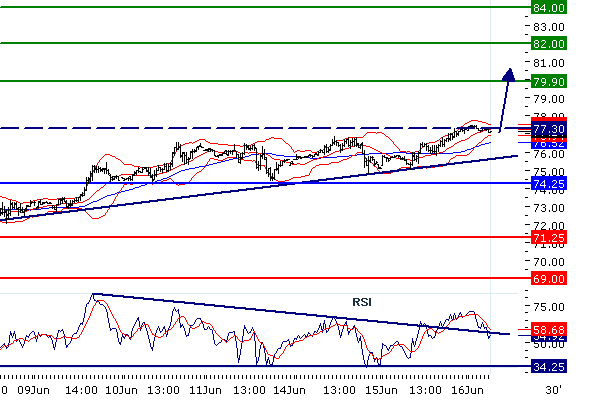 Наше предпочтение: ПОКУПАТЬ выше 74.25 с целевыми точками 79.9 и 82.