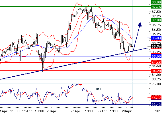Наше предпочтение: ПОКУПАТЬ выше 85 с целевыми точками 87 и 87.75.