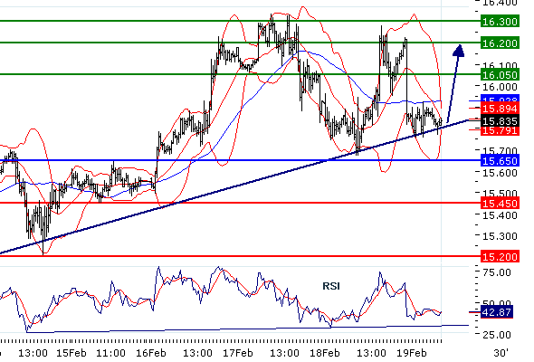 Наше предпочтение: ПОКУПАТЬ выше 15.65 с целевыми точками 16.05 и 16.2.
