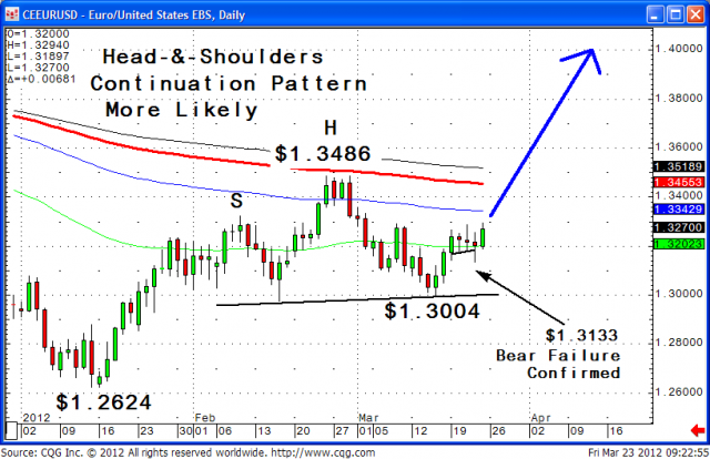 ЛОНДОН, 23 марта. /Dow Jones/. Фигура "голова и плечи" на дневном графике пары евро/доллар США, вероятно, скорее станет указывающей на рост фигурой продолжения, чем фигурой разворота.