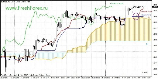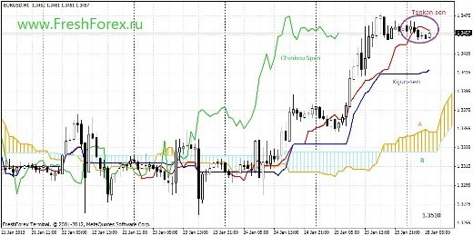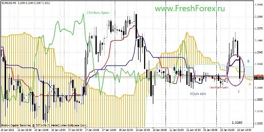 Вчерашняя цель достигнута. Сигналы индикатора: Линия Тенкан находится выше линии Киджун. Цена пересекла Тенкан и находится между Тенкан и Киджун. Цена и линии выше облака. Облако растущее. Краткосрочный прогноз: Линии и цена выше облака, сигнал к росту цены, но так как цена пересекла Тенкан и находится между линиями, можно ожидать небольшой флет, после чего рост цены до 1.3620.