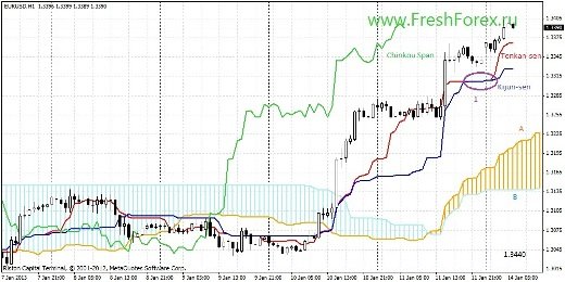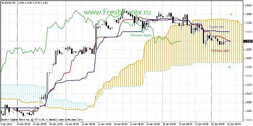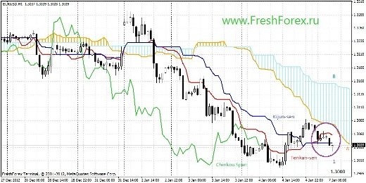 Сигналы индикатора: Линия Тенкан и линия Киджун, а так же цена находятся в облаке. Особого направления рынка не просматривается. Краткосрочный прогноз: Линии Тенкан и Киджун пересеклись в облаке «Мертвым крестом», но это слабый сигнал к падению цены. На рынке флет, в рынок входить не желательно.