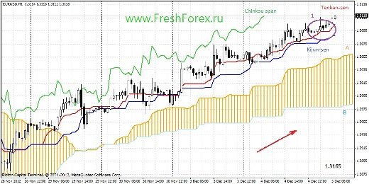 Сигналы индикатора: Линия Тенкан и линия Киджун вышли с облака (1). Тенкан находится выше Киджун. Цена пробила Тенкан (2). Облако растущее. Краткосрочный прогноз: Как мы видим Цена – Тенкан – Киджун – Облако, хороший сигнал на рост цены, можно ожидать роста цены до 1.3190