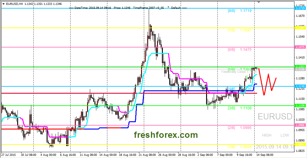 14 сентября 2015, EUR/USD. Пара тестирует верхнюю границу канала (3/8 - 5/8).