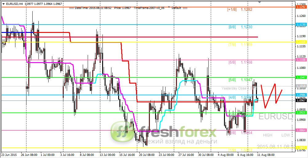 11 августа 2015, EUR/USD. Пара вошла в канал (3/8 - 5/8).