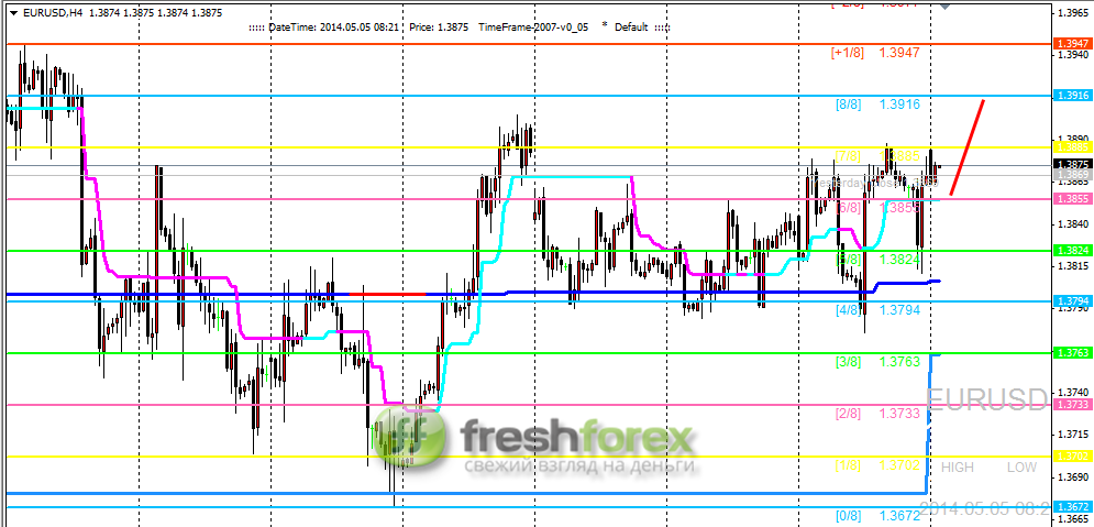 Четырехчасовой график EURUSD. Пара в очередной раз тестирует на прочность уровень 1.3885 (7/8). На данный момент вероятность его преодоления снизу-вверх очень велика. Именно этот вариант рассматриваем в качестве основного. В качестве поддержки рассматриваем уровень 1.3855 (6/8). Только после пробоя этой отметки сверху вниз можно будет ожидать очередного отката цены вниз.