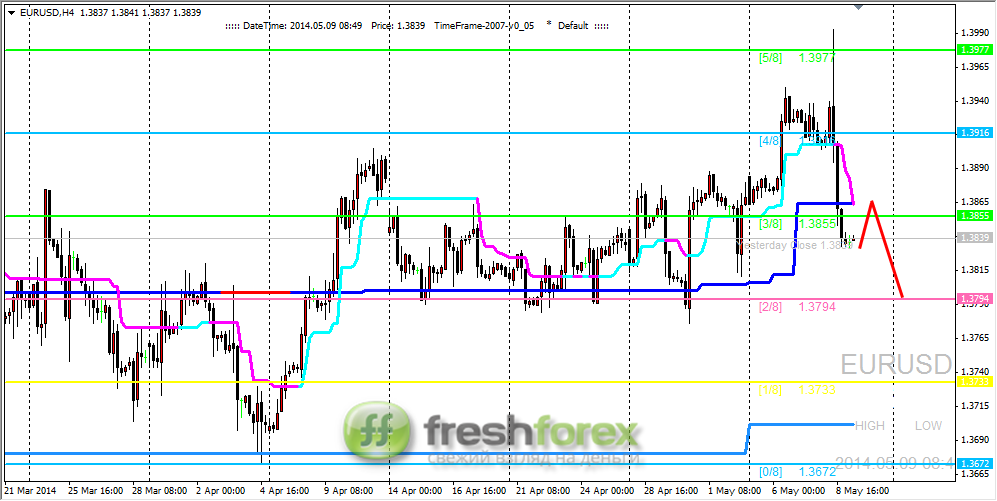 08 мая 2014, EUR/USD. Паре не удается удержаться выше уровня (8/8).
