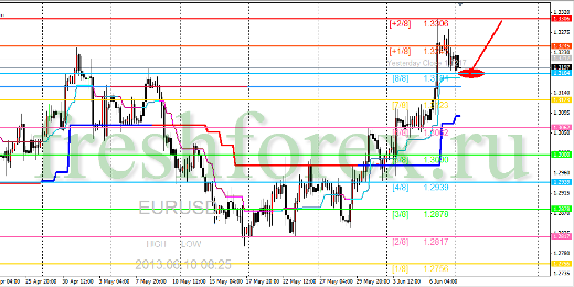 10 июня 2013, EUR/USD. Уровень (8/8) ограничивает выход из зоны перекупленности.
