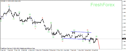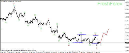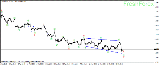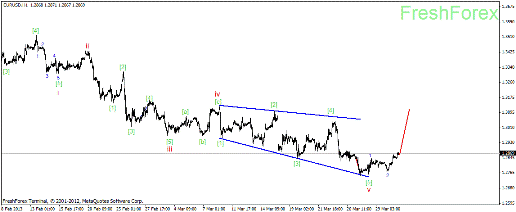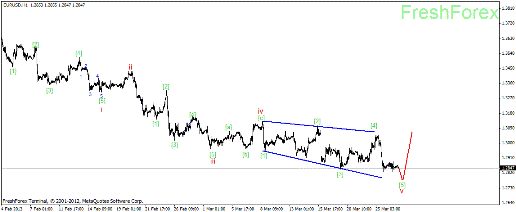 Ситуация по данной рассматриваемой паре остается крайне запутанной. Цену дергают из стороны в сторону фундаментальные факторы приходящие из Европы. Тенденция сохраняется нисходящей. Возможно в нисходящей импульсной волне v идет развитие конечного диагонального треугольника. Если это так, то в ближайшее время нас ожидает небольшой рост к верхней образующей линии обозначенной модели, откуда цена вновь начнет снижение.