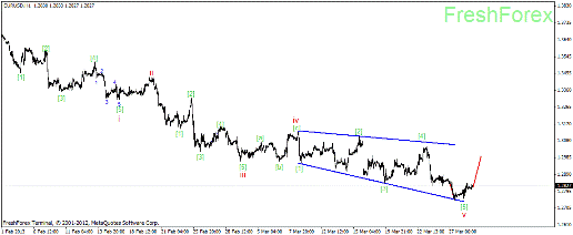 Евро нынче очень не стабилен. Лихорадит его очень мощно, и причины всем известны. Но не будет затрагивать фундаментальные факторы влияющие на рынок, перейдем к волнам. В предыдущем обзоре рассматривалась возможное развитие волны v нисходящего импульса. Пока же вариант сохраняет свою актуальность. Возможно в данный момент завершается формирование волны [2] of v, которая приняла форму плоскости. Если это предположение верно, то в скором времени нас ожидает возобновление нисходящего импульсного снижения.