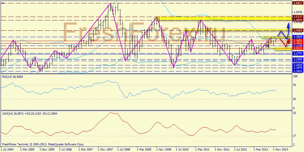 Месячный график: нас ожидает повторное тестирование зоны 1.3859 (верхняя полоса Боллинджера), после чего быки либо сразу предпримут попытку атаки 1.4260, либо позволят себе откат в зону средней (1.3121, красная стрелка).