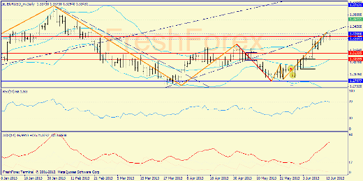 13 июня 2013, EUR/USD. Сильное сопротивление по евро в зоне 1.3375-1.34.
