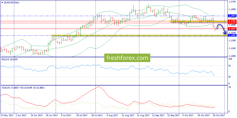 Дневной график: ADX продолжает находиться в слабой зоне, поэтому, на фоне пробоя нижнего конверта Боллинджера, возможен откат в зону средней полосы Боллинджера (1.1762), откуда можно продавать в направлении 1.1485.