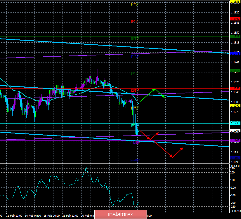 EUR/USD. 11 марта. Торговая система «Каналы регрессии». Евро немного вырос, но вряд ли сломает нисходящий тренд.