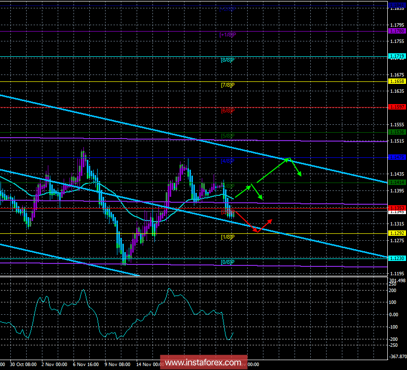 EUR/USD. 28 ноября. Торговая система «Каналы регрессии». Первые признаки завершения нисходящего тренда.