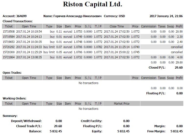Итоги моей торговли по фундаментальному анализу во FreshForex 24 января: