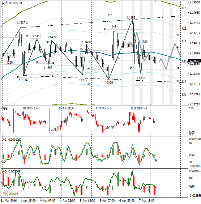 Евро/доллар с 1 апреля (День Смеха) находится в боковом тренде. Все дневные свечи за эти дни похожи на доджи с длинными тенями. Вчерашняя смешанная динамика в паре вызвана повышением цен на нефть и заявлениями представителя ФРС США Харкера.