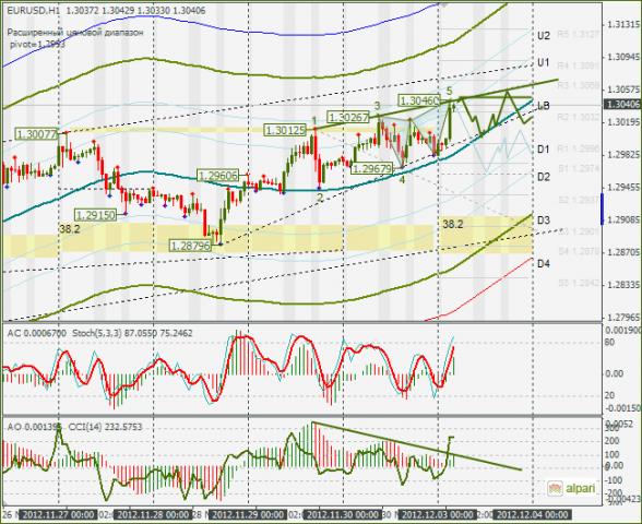 В четверг по основному сценарию расчетная цель была достигнута. А вот откаты вызванные Дж.Бонером вносят неопределенность. Сегодня правительство Японии одобрило второй пакет стимулирования экономики на 880,3 млрд. иен. Это решение оказало поддержку валютам через кроссы с йеной. На этом фоне евро/доллар еще раз протестировал 1,3005. Я за то, чтобы евро ушла к 1,3050/60, но меня беспокоит падение AUDUSD и NZDUSD. Если кроссы по ауду развернутся, это позволит AUDUSD отскочить вверх. Для того, чтобы привлечь новых покупателей на рынок, необходимо с открытия скупать евро.