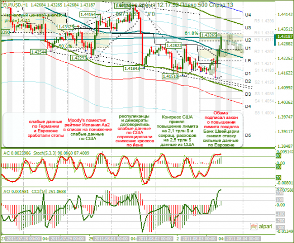 Барак Обама подписал законопроект о поднятии потолка госдолга и сокращении бюджетного дефицита. На этом фоне евро снизился и сейчас все внимание переводят на макростатистику из США и Еврозоны. Сегодня выходит важный отчет ADP, завтра состоится заседание ЕЦБ, и в пятницу пейролс. События важные, а так как на рынке нарастают опасения по поводу снижение темпов экономического роста США, то волатильность будет высокой. Золото сегодня утром установило новый максимум 1661,19. Никакой фиксации после поднятия потолка.