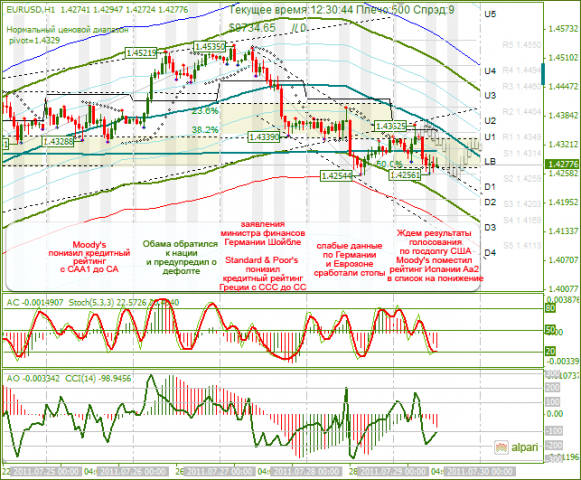 Из еженедельного обзора: «…В пятницу с уровня 1,4229 евро восстановил свои позиции до 1,4412. Это произошло благодаря слабым данным по США. Данные данными, а республиканцы с демократами так и не договорились. Сегодня воскресенье, и до дефолта отсчет ведется уже не днями, а часами.