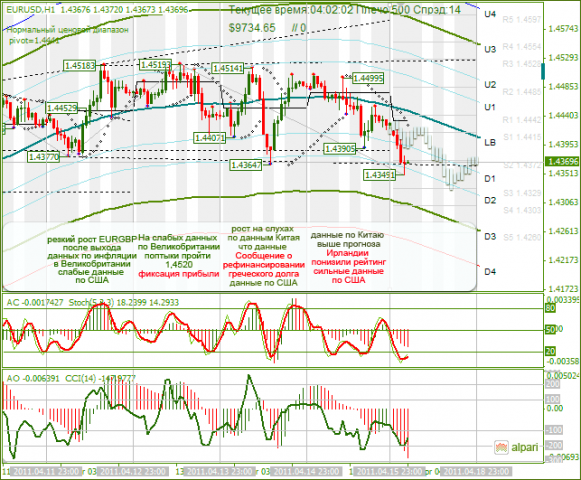 Курс евро/доллар в пятницу закрылся снижением по 1,4428 и сегодня провалился к 1,4343. В еженедельном обзоре я написал, что эта неделя очень важная для евробыков. Не смогут пробить 1,4520, значит откат до 1,4190/60. За последнюю неделю сформировался коридор с границами 1,4524 и 1,4360. Сегодня на прочность проверили нижнюю границу. Причина снижения - Народный Банк Китай с 21 апреля для банков повысил норму резервирования на 0,5 пункта до 20,5%.