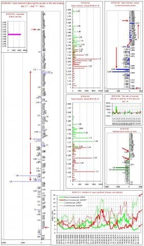 Внимание следует обратить на огромные объемы (выше исторического максимума) длинных позиций коммерческих игроков по EUR, которые хеджируют короткие позиции спекулянтов. Данные объемы сравнимы с объемами, которые регистрировались во второй половине мая – начале июня 2010 г. Напомним, что 07.06.2010 пара в ходе «кризиса EUR» достигла минимума и развернулась на фоне экспирации опционных и фьючерсных контрактов, а также на фоне действий ФРС США по предоставлению долларовой ликвидности. Далее важно, что текущие объемы спекулятивных длинных позиций по EUR минимальны по историческим меркам и сравнимы разве что с ситуацией октября 2008 г., когда USD начал демонстрировать ослабление после пика кризиса ликвидности. Недавние действия Центробанков не нашли отражения в диаграммах. Можно предположить возможность резких движений в привязке к очередному заседанию FOMC.