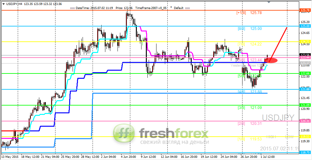 02 июля 2015, USD/JPY. Пара пытается закрепиться выше уровня (6/8).